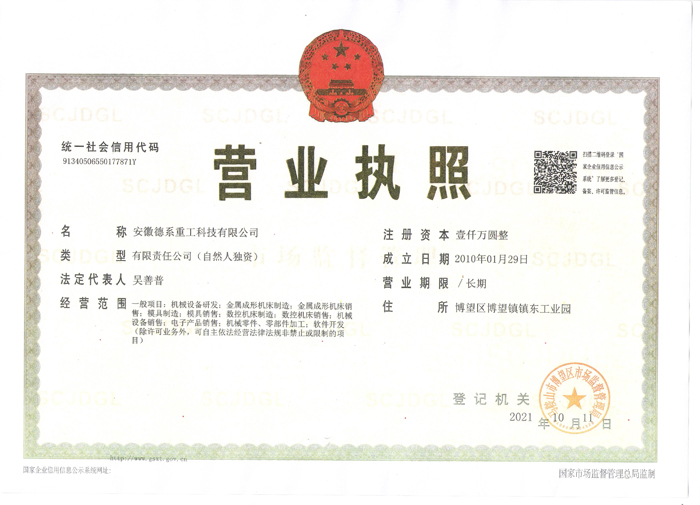 安徽德系重工科技有限公司成立于2010年,拥有《市级企业技术中心》、《马鞍山科学技术局弯曲工程技术研究中心》两个研发中心,连续九年被评为《国家高新技术企业》,更是业内唯一获得《武器装备科研生产单位三级保密资格证书》和《武器装备质量管理体系认证》的企业。 公司产品拥有九项发明专利和十五项实用新型专利,荣获《安徽工业精品》《安徽省新产品证书》《安徽省名牌》《安徽省著名商标》并通过欧盟CE认证和德国莱茵认证,产品畅销海内外。